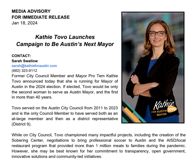 I’m still committed to these same progressive values: equity, honest government and standing up for women, workers, immigrants and our LGBTQIA+ community. You can also count on me to fight against bad plans like the I-35 expansion and the State’s attacks on our local freedoms. This campaign will be about engaging with Austinites throughout the city to craft a vision where every Austinite has the opportunity to succeed and thrive.”