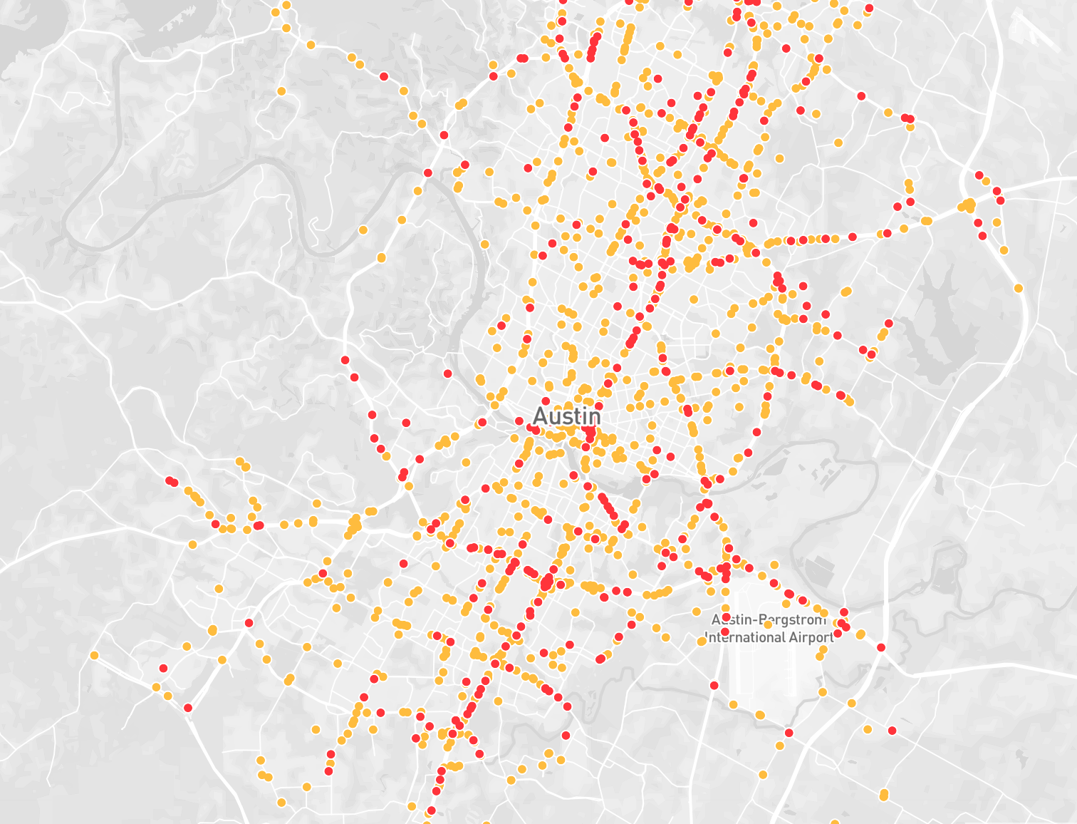 The map from the city's Vision Zero dashboard documents every fatal (red) and serious injury car crash over the past four years. I-35 is by far the greatest contributor to road carnage, but SH 71 and US-183 do their part as well. Mopac is far safer.