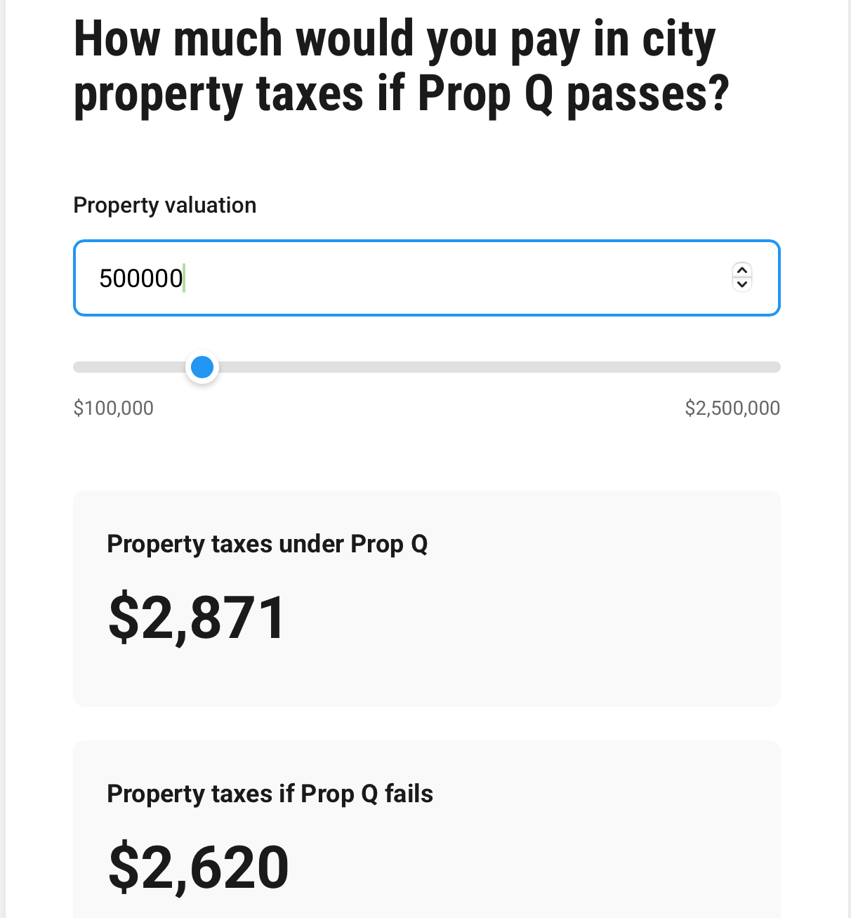According to KUT's calculator, if your property is worth $500k, you would pay $2,871 if Prop Q passes and $2,620 if it fails.