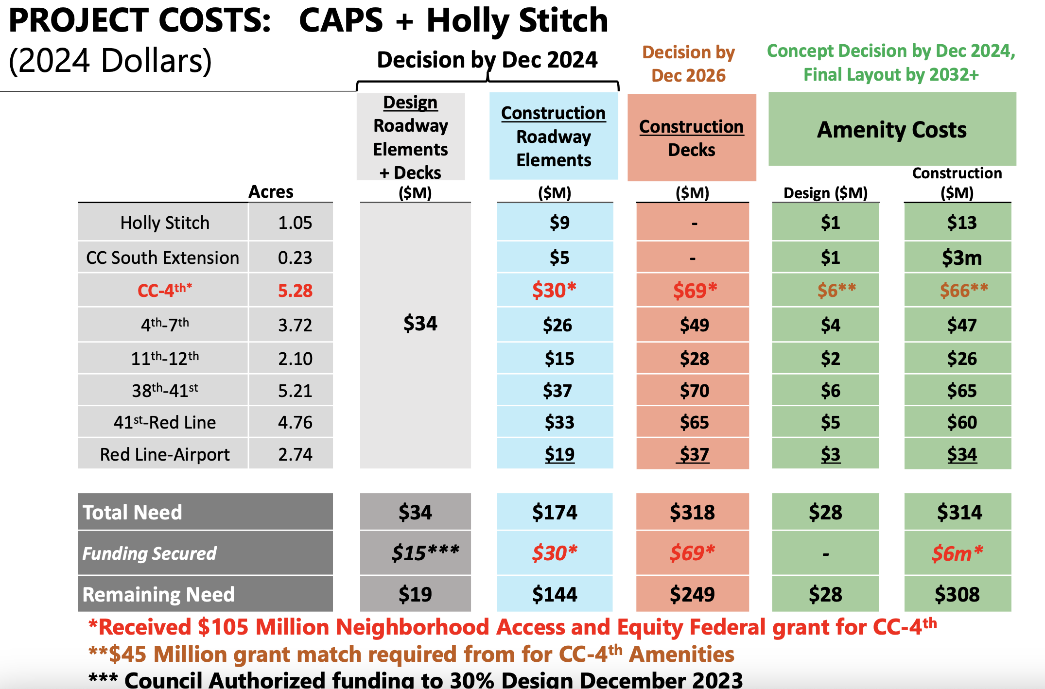 Here is the city's estimated breakdown of costs for the different caps and the Holly Stitch, which is a glorified bridge.