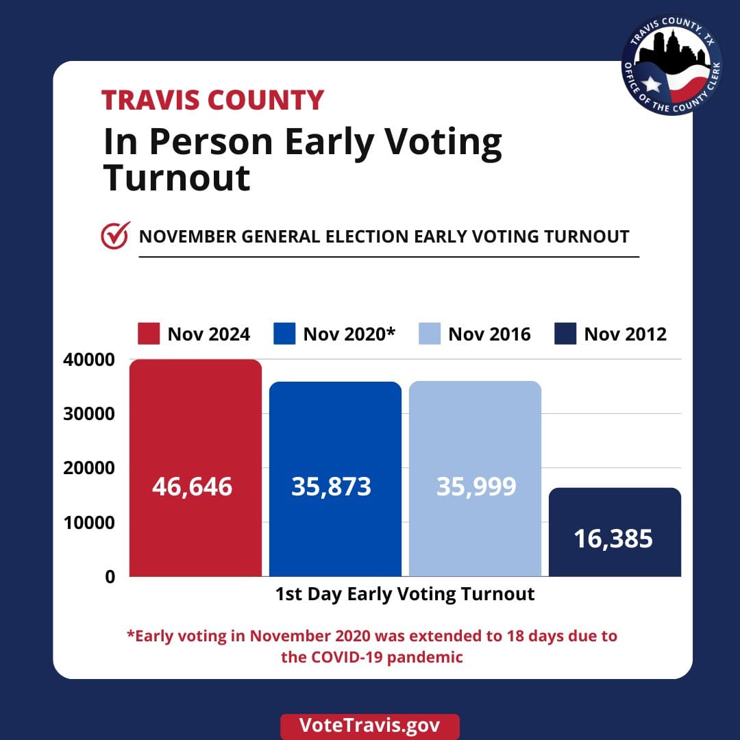 Yesterday was the first day of early voting and Travis County saw a big jump in total votes over 2020. But it's important to keep in mind that a lot more people voted by mail in 2020 due to Covid.