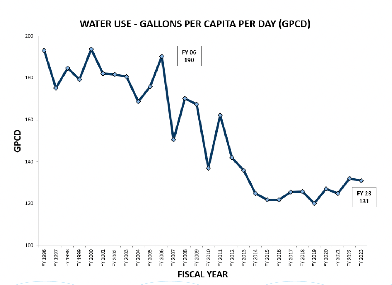 The good news is that, even as water use continues to fluctuate, we use much less water on average now than we did in the 1990's or 2000's. Over the past ten years, which has included periods of drought, we have topped out at about 132 gallons per day. In contrast, between 1996 and 2006, we ranged between 170 to 190 per day.
