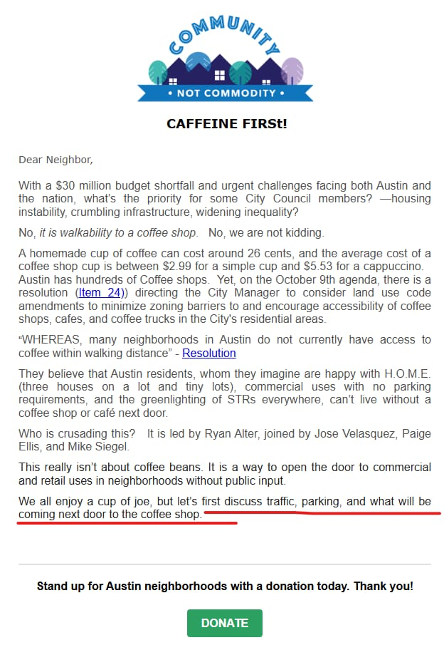 Austin's lead NIMBY group raises alarms about coffee shops.