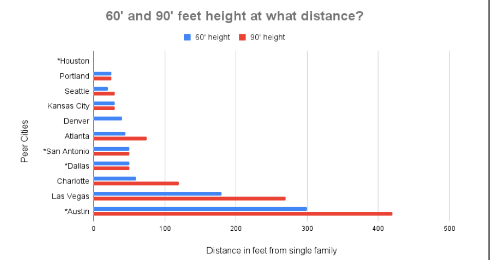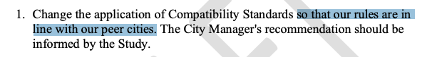 The original draft, authored by Chito Vela, asked city staff to draft an ordinance that would cap compatibility at a maximum of 100 feet. Today, Vela accepted an amendment from Ryan Alter that made the direction less specific. Now it just tells staff to bring the rules in line with "peer cities."