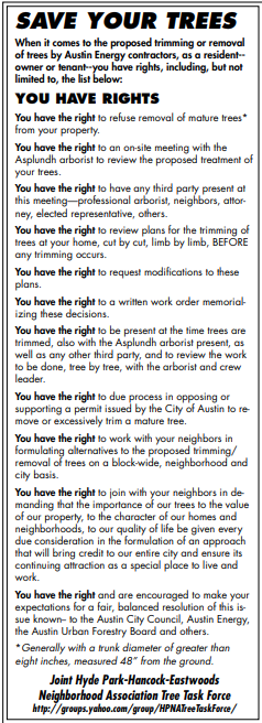 To get a sense of the hysteria that prompted Council's past decisions, check out the Hyde Park Neighborhood Association's February 2006 newsletter, which denounced the "obliteration" of the neighborhood's tree canopy and approvingly cited a neighbor who denounced the utility's "Shermanesque, scrorched-earth approach" to vegetation management. HPNA applauded then-Mayor Will Wynn and then-Council Member Lee Leffingwell for putting a halt to the "carnage."