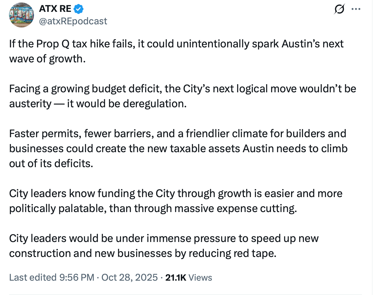 On the eve of Prop Q, an anonymous real estate account on Twitter offered a pretty good take on the road forward for the city of Austin: