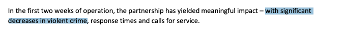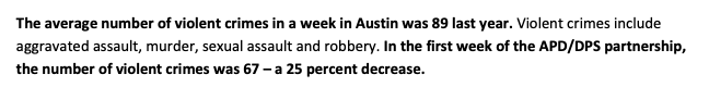 What numbers might suggest that DPS has made a difference? Easy: how many violent crimes were reported the week before the partnership kicked off? More than 67?