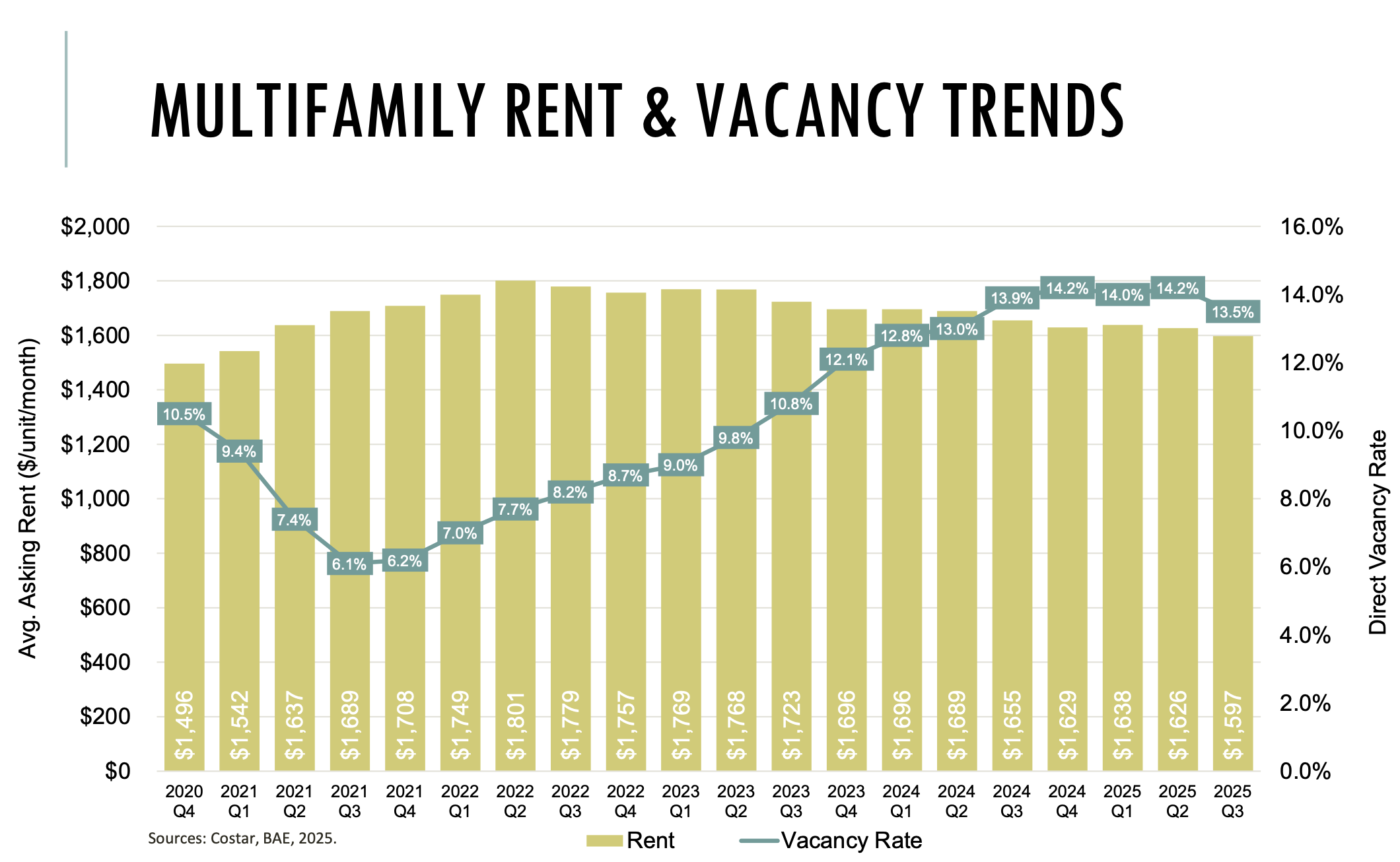 This chart from the presentation is based on data gathered by Costar, a real estate analytics firm. It shows how the drops in average rents correspond to the rise in vacancy rate.