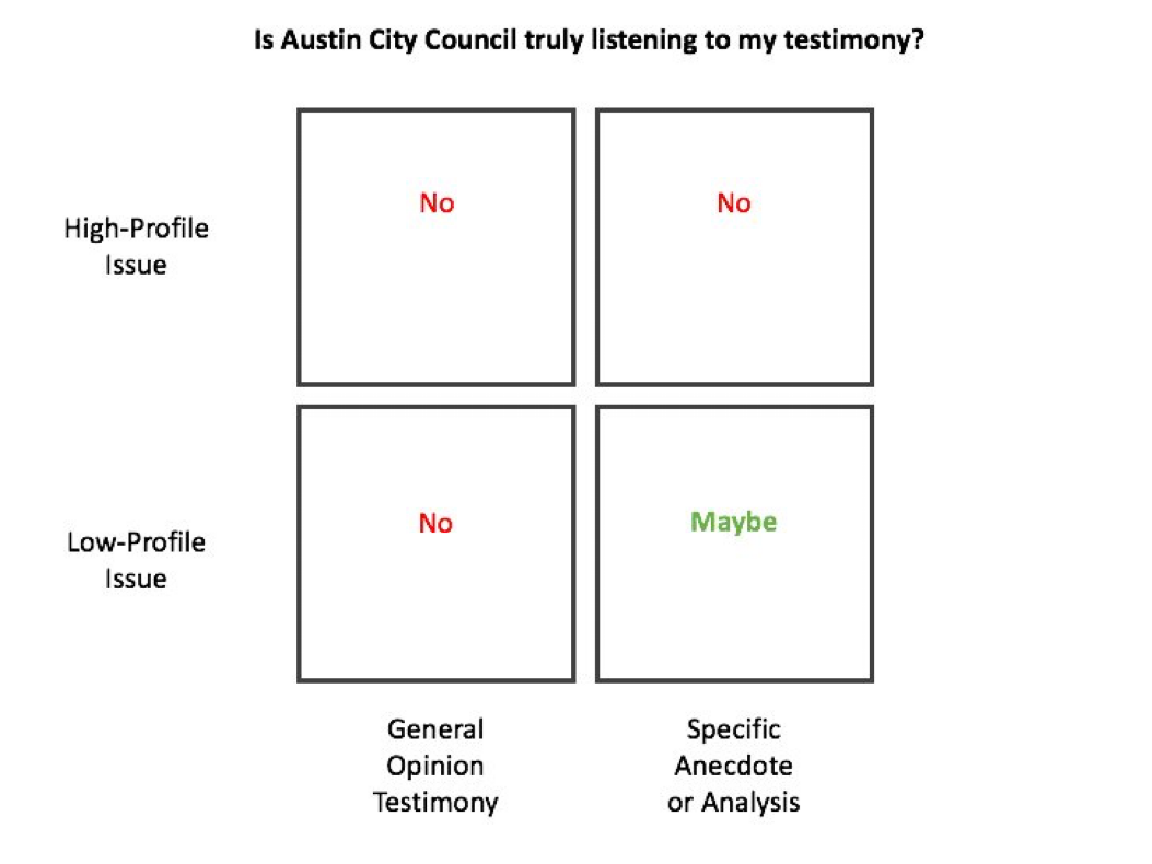 He distinguishes "truly listening" from what happens on high-profile issues, which is that Council members are influenced by the number of people who show up to speak on an item, even if they're not going to closely listen to what each person says.