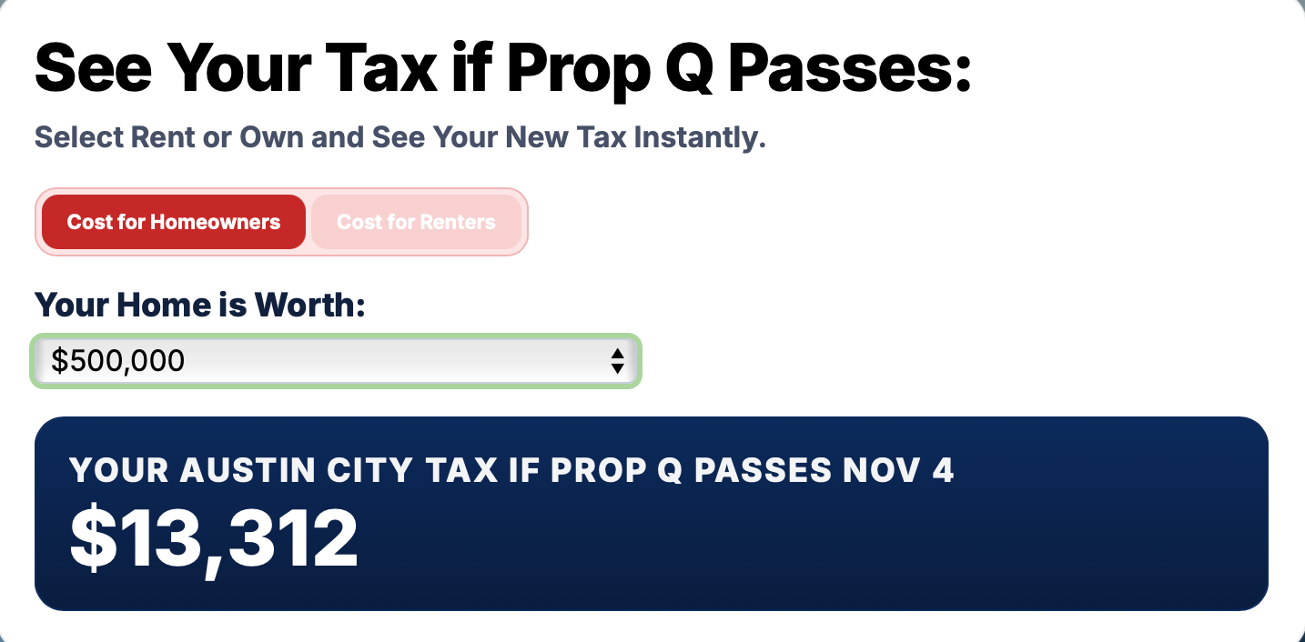 For instance, Save Austin Now has brilliantly created this "tax calculator" that apparently calculates your taxes and then adds many thousands on top. According to it, the owner of a $500,000 home (close to the city median) will owe $13,312 in "Austin city tax" if Prop Q passes.