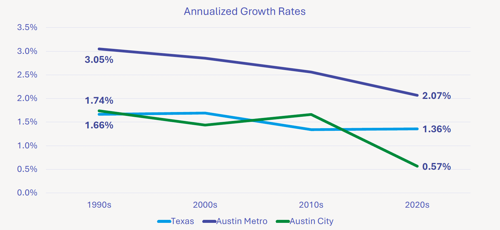 The population of the city of Austin, the Austin metro area and Texas are all growing, but the rate of growth has slowed for all three. The rate of growth in the city of Austin has dramatically declined over the past decade.