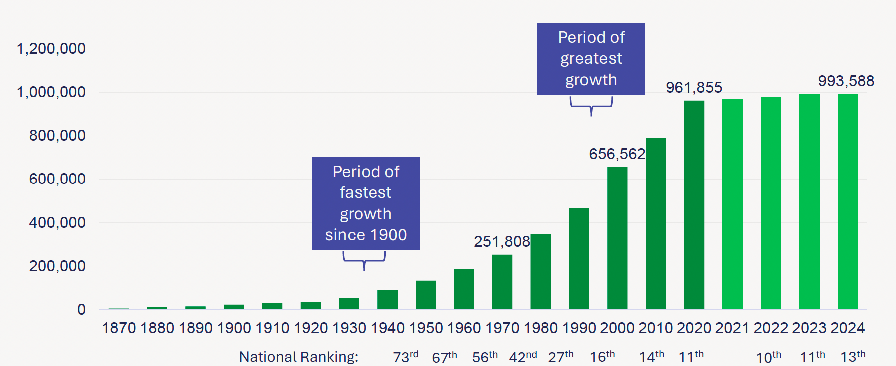 This slide illustrates the fact that rapid population growth has been the story of Austin since its founding. The pattern throughout the city's history has been that the population doubles every 20-25 years.