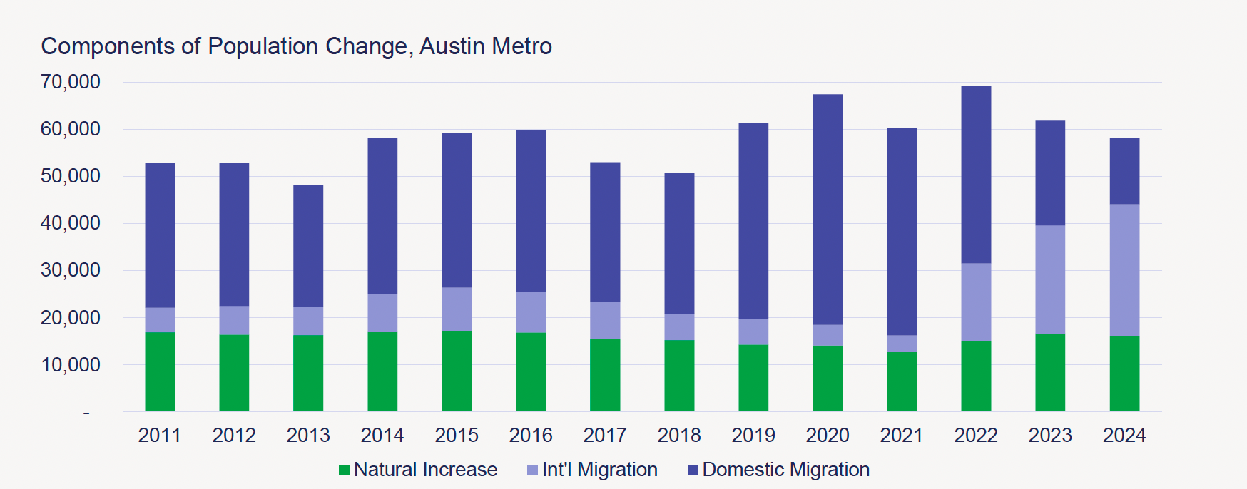 In recent history, migration has accounted for the great majority of population growth, as opposed to "natural" increases from births. What's interesting is the huge upswing in international migration in the three post-pandemic years.