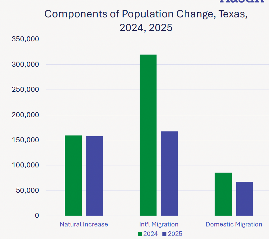 There is not yet Austin-specific data, but you can bet the number of international newcomers plummeted in 2025. International migration to Texas plummeted nearly 50%. Domestic migration also took a noticeable dip: