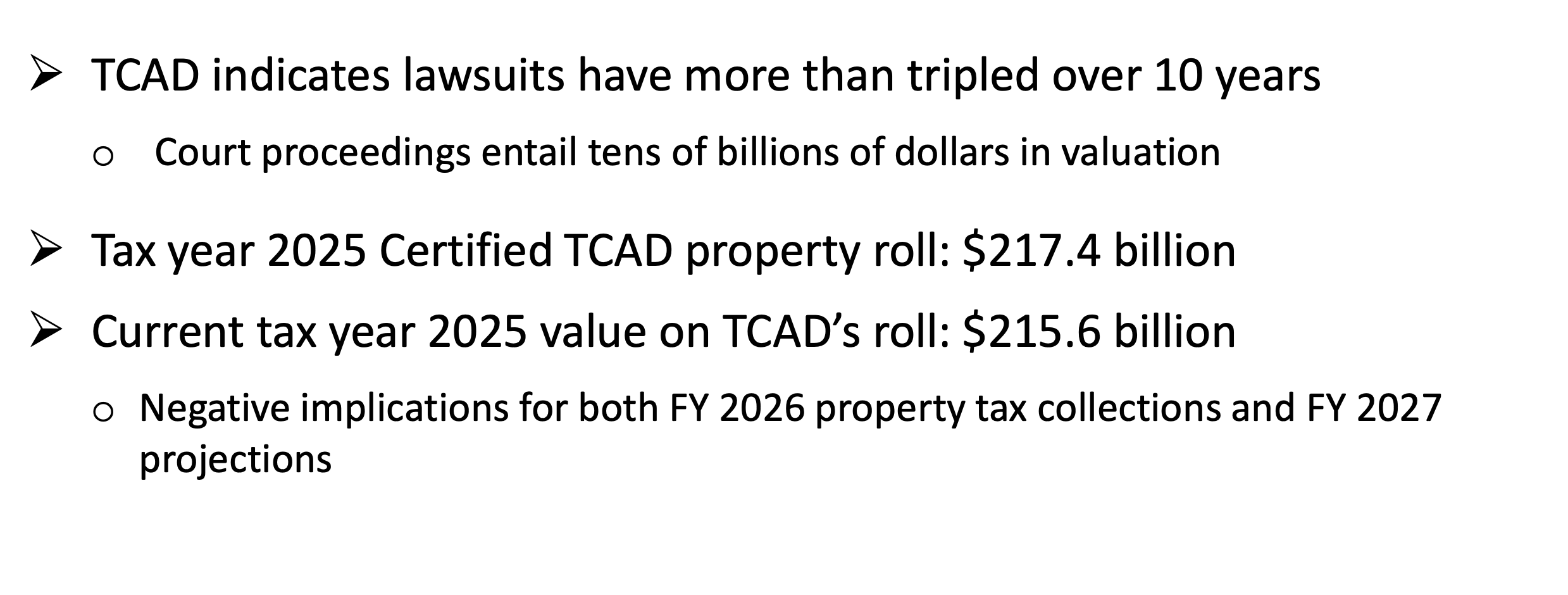 The issue is that City Council passes its budget and the tax rate in August based on appraisals set in the summer by the Travis Central Appraisal District. However, there has been a dramatic increase in the number of people who are not only protesting their appraisals, but suing TCAD after their protest is denied. In some cases, they're winning and getting their appraisals revised.
