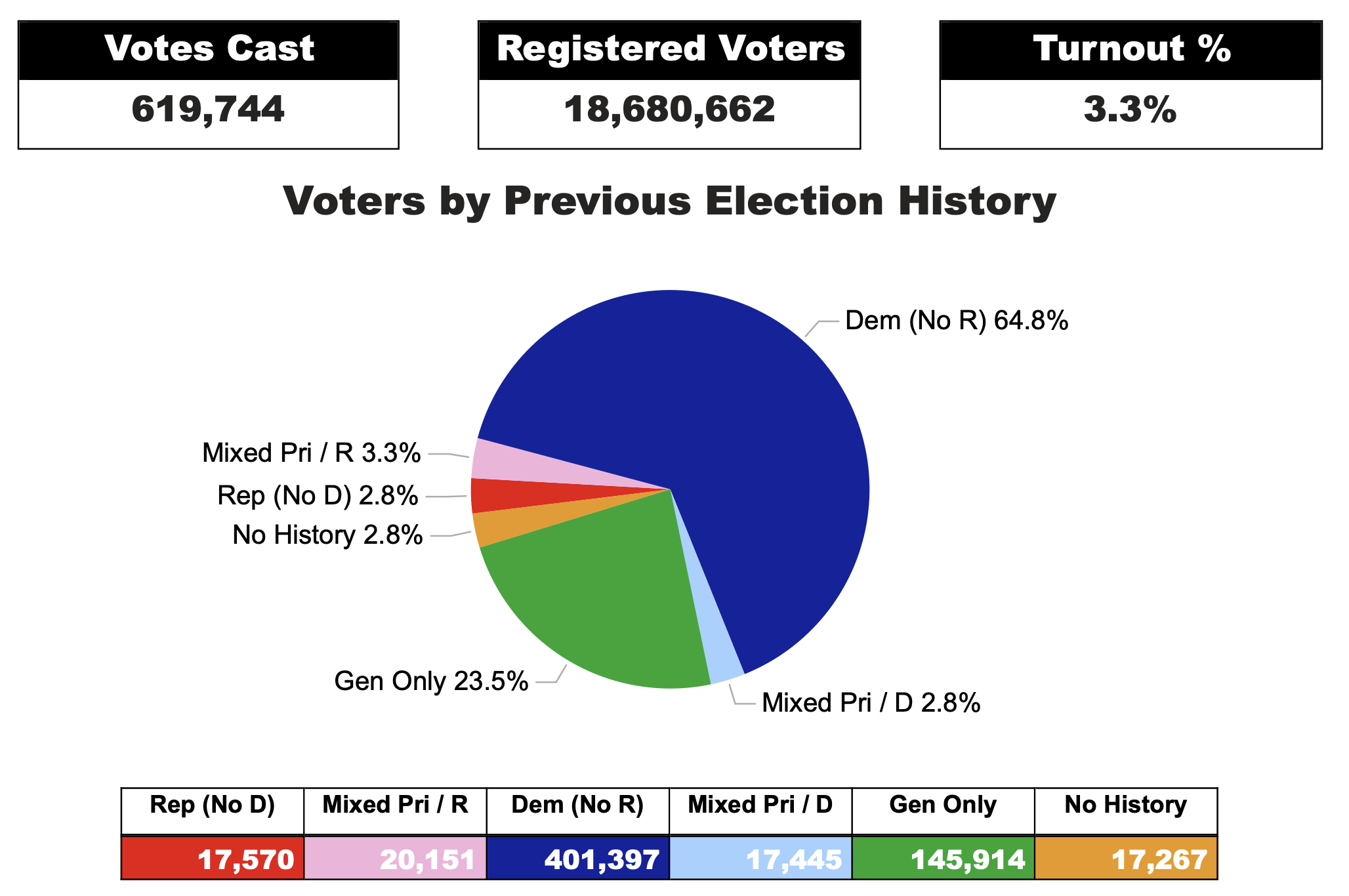 And on that front, there are encouraging signs for Dems. Nearly a quarter of the votes cast in their primary come from people who have only ever voted in general elections. That hints at a higher level of engagement among normies than usual. In the 2024 & 2022 primaries, only about 14% of Dem primary voters had "gen-only" history. This year looks more like 2020, when the share was 30%.
