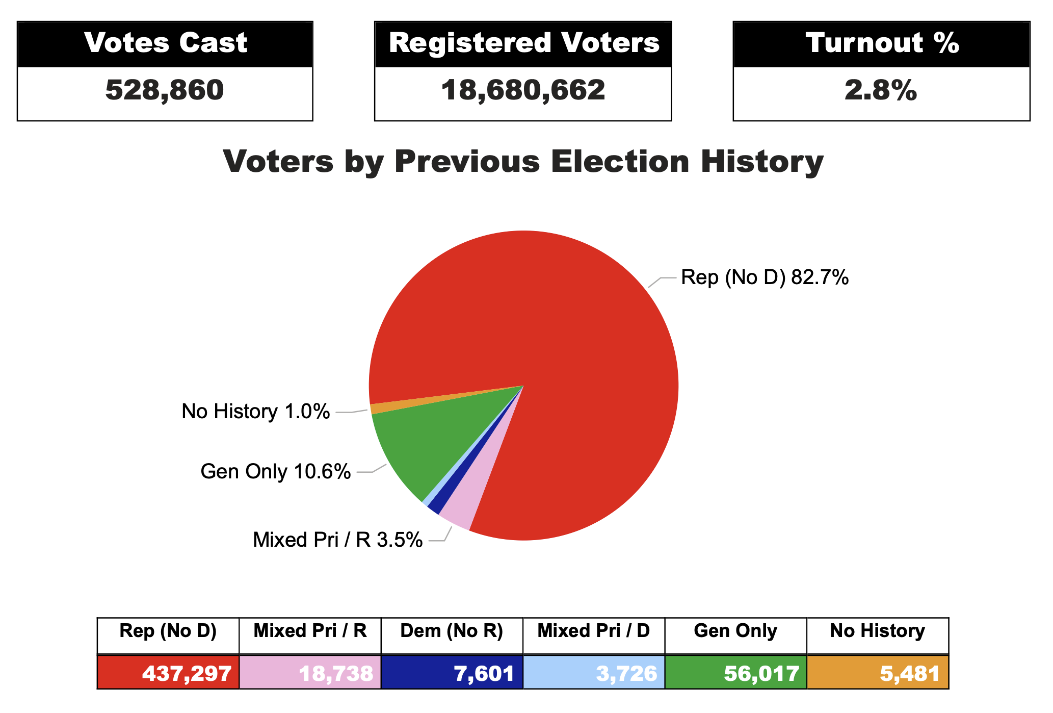 Meanwhile, it's the first primary election for only 10.6% of GOP voters, compared to between 15-17% in the past three election cycles.