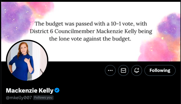 The lone vote against was of course Mackenzie Kelly, the only Republican on the dais, whose Twitter theme even celebrates her no vote from a previous year.