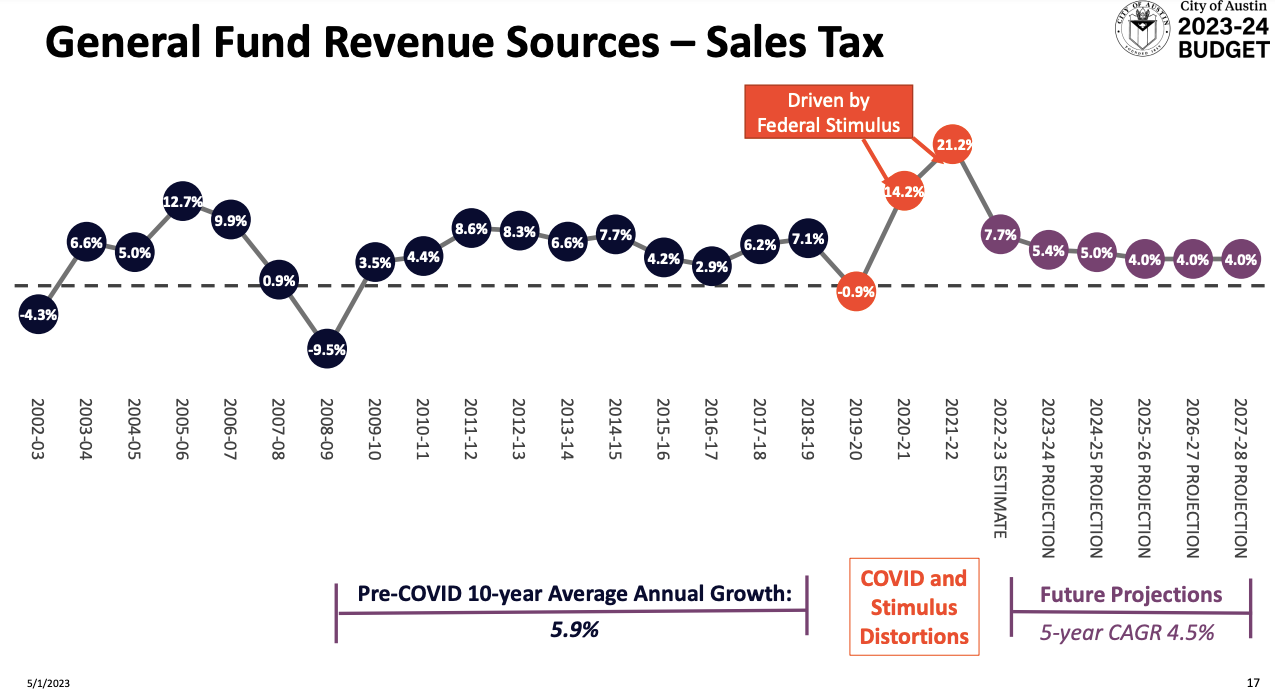 The chart below, included in a presentation given to Council on Tuesday by city CFO Ed Van Eenoo, shows how anomalous the last two years of sales tax have been. Van Eenoo described the revenue as "unsustainable," and is therefore assuming far lower levels of growth in the coming years.