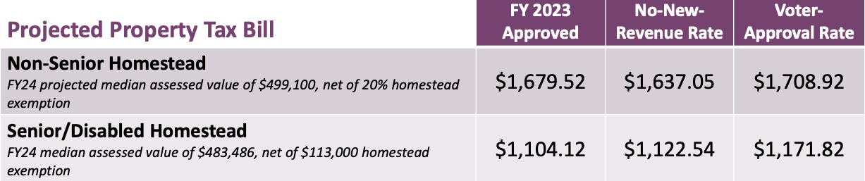 Taxes on the median homestead would actually decline $42 if Council adopts the no-new-revenue rate this year, while they would rise by $29 if it goes up to the 3.5% cap.