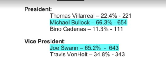 The members of the Austin Police Association overwhelmingly voted for a change in leadership. Incumbent president Thomas Villarreal only received 22% of the vote, or about a third as many votes as the victor, Michael Bullock. The other challenger, Bino Cadenas, came in a distant third with only 11%.