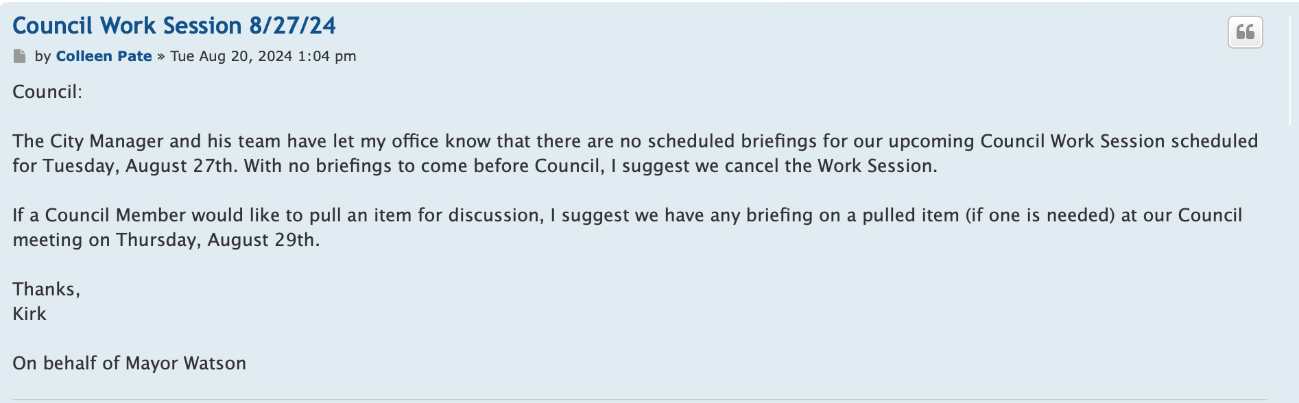 On the Council message board last week, Watson chief of staff Colleen Pate proposed canceling Tuesday's work session. The reasoning: there are no staff briefings.
