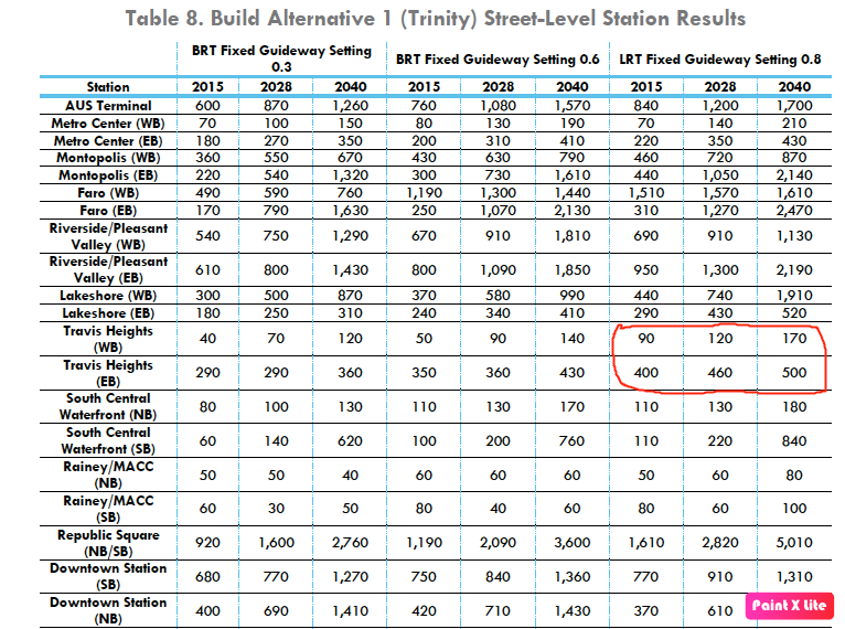 Just compare its performance to some of the stations with more multifamily housing nearby. 1,270 people a day will board the train going west from Riverside & Pleasant Valley in 2028. By 2040, that will nearly double to 2,470. Meanwhile, the Travis Heights westbound station will generate 460 riders a day in 2028 and 12 years later that figure will have only increased by 40 –– to 500.