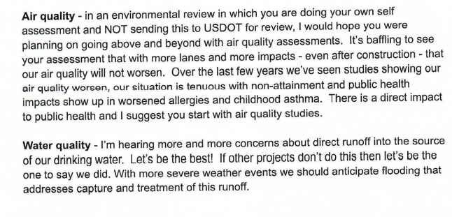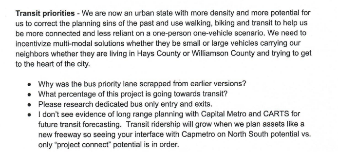 So many residents living in and around the core of IH35 are opposed to any of the plans TXDOT has put forth, the City wants more - the County wants more and the legislators want more so what weight do those letters carry? My concern is we ask for people's opinion and then ignore them - then they check out and say "government sucks."