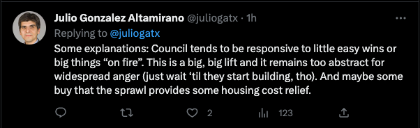 City Council voted 10-1 in favor of a resolution that ever-so-nicely asks the Texas Dept of Transportation to consider a number of changes to its proposed expansion of I-35 but does not challenge the expansion itself. The requested changes include more east-west crossings, slower design speeds for the frontage roads, better drainage and, of course, covering as much of the highway as possible with caps for green space and new development.