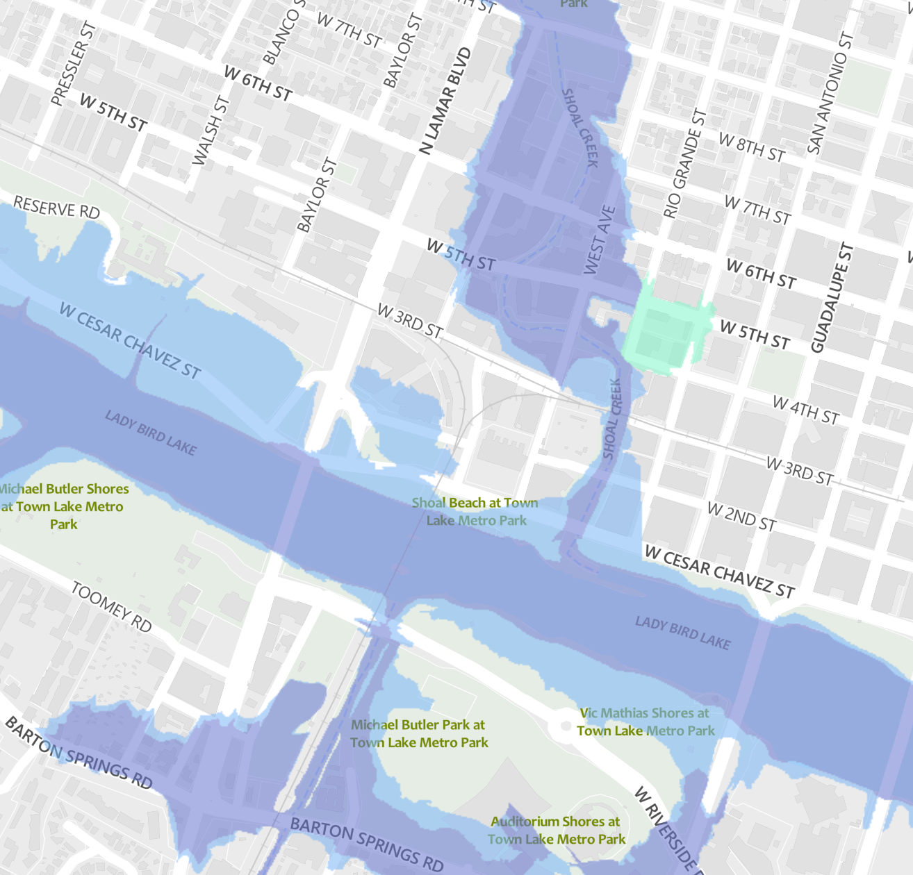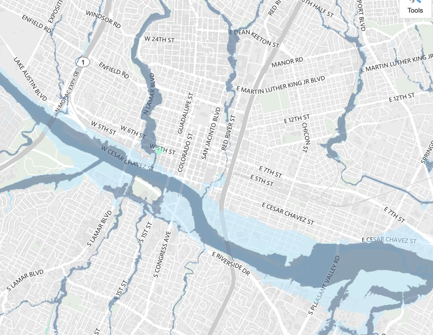 Because the city has not yet mapped the new 100-year floodplain, it has instead been relying on FEMA's 500-year floodplain. For most of the city's creeks, the difference between the two boundaries is barely perceptible on a map. The notable exception, however, is in neighborhoods near the Colorado River, including downtown and the east side, where the 500-year floodplain (light blue) extends far into residential and commercial areas.