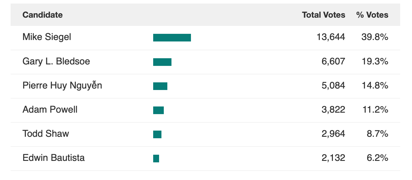 Mike Siegel, who ran as a staunch pro-housing progressive, came in a strong first place in District 7, which Leslie Pool is vacating after 10 years on the dais. Gary Bledsoe, a late entrant to the race whose campaign is largely driven by opposition to HOME and opposition to the Council majority, came in second place and will face off against Siegel in the runoff.